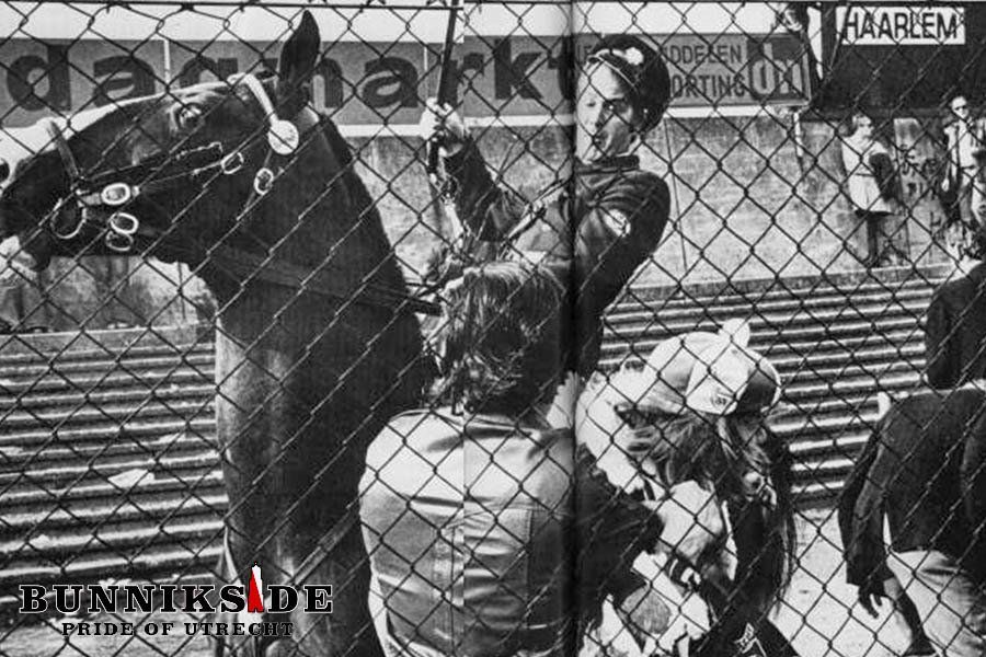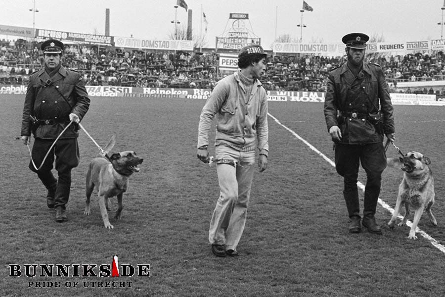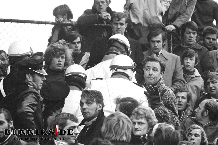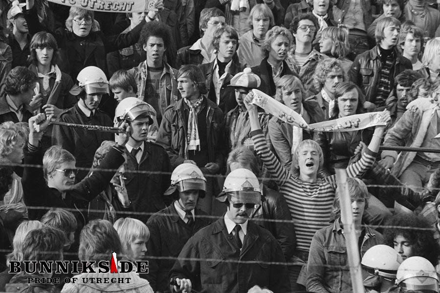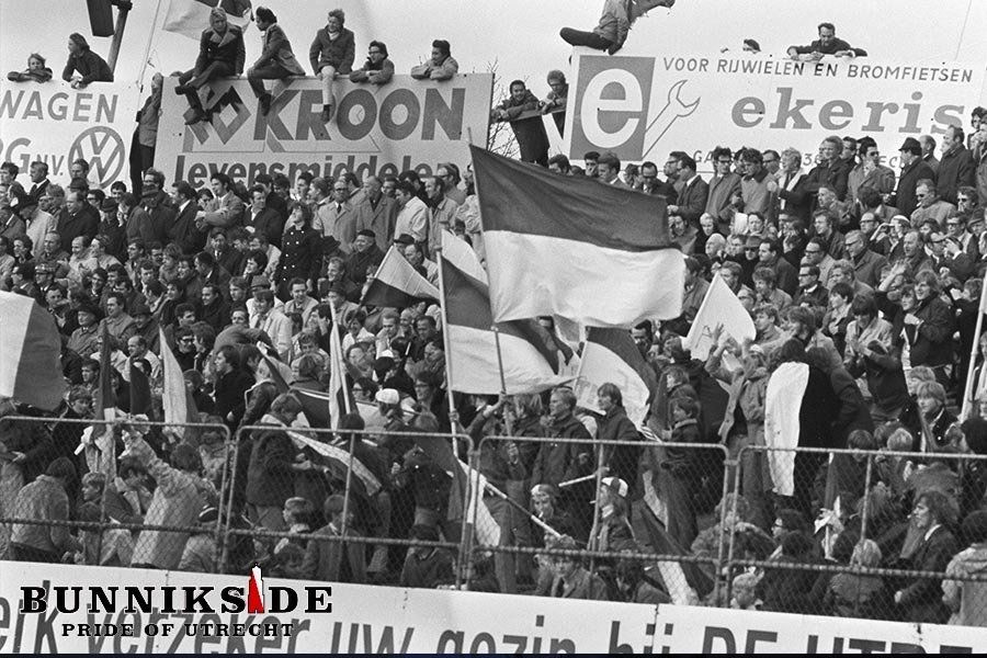 Vanaf toen ging ik met jongens uit Zuilen elke wedstrijd naar FC Utrecht. We gingen met de fiets naar het stadion en zwaaiden onderweg met grote vlaggen.. De hele week waren we bezig met het maken van vlaggen, we wilden natuurlijk de grootste op de BunnikSide hebben. Met dat soort onschuldige dingen hielden de jongens op de BunnikSide zich toen bezig. We waren meer onderling aan het dollen, dan naar het voetbal aan het kijken. Er gebeurde altijd wel iets, het was echt een ongeorganiseerd zooitje. Maar geleidelijk aan kwam daar verandering in….jongens en bendes vanuit heel de stad en omgeving vonden de BunnikSide en wilden er bij zijn en horen. We merkten dat tegenstanders en scheidrechters ons erg intimiderend vonden.