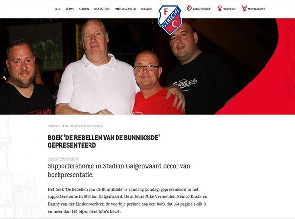Toen FC Utrecht op 22 september in Heerenveen met 1-1 gelijkspeelde, vond er in supporterhome Number 4 een gezellige middag plaats. Ruim honderd supporters waren afgekomen op de boekpresentatie van ‘De Rebellen van de Bunnikside’. Veel jongens die meegewerkt hebben aan het boek waren aanwezig. Het was prachtig om alle (oude) verhalen door het supportershome te horen gaan. De deuren gingen om 11.30 uur open en al snel kwamen de eerste mensen binnen om het boek te bemachtigen. Langzaam werd het steeds drukker en om 12.15 uur keken we met zijn allen naar de verrichtingen van ons cluppie in Friesland. In de rust nam de voorzitter van de supportersvereniging Teun den Hartog het woord en opende zo de boekpresentatie. ,,Het is een fantastisch historisch document geworden waar we als club, SV en als supporter supertrots op mogen zijn. Deze jongens hebben heel veel aan de kant gezet de laatste tijd. Het is niet niks om avond aan avond druk te zijn met een boek en om je gezin even naar de achtergrond te zetten. En allemaal om ze onze historie vast te leggen. Het is een geweldig verhaal geworden.’’