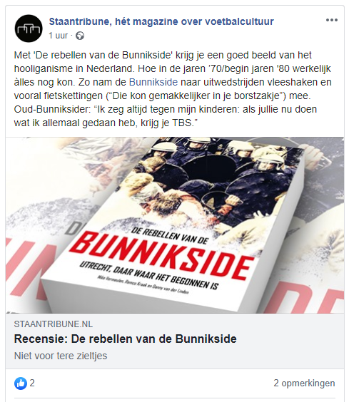 De auteurs van ‘De Rebellen van de Bunnikside!’ hebben puik werk geleverd. De afwisseling tussen persoonlijk drama, geweld en kameraadschap maakt dat het boek smakelijk wegleest. De hoogte- en dieptepunten van de Bunnikside volgen elkaar in hoog tempo op. Humorvolle anekdotes maken het boek compleet!
